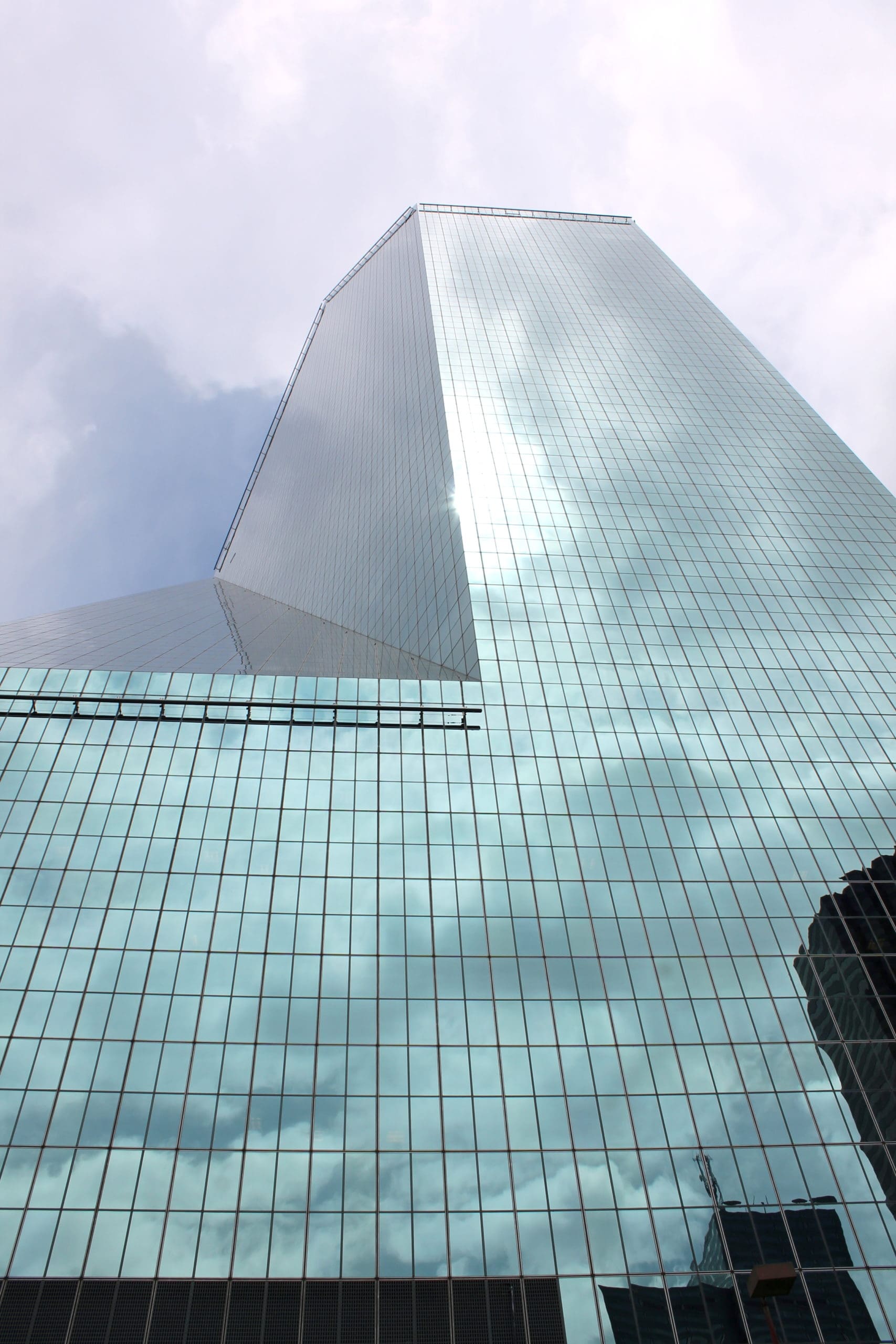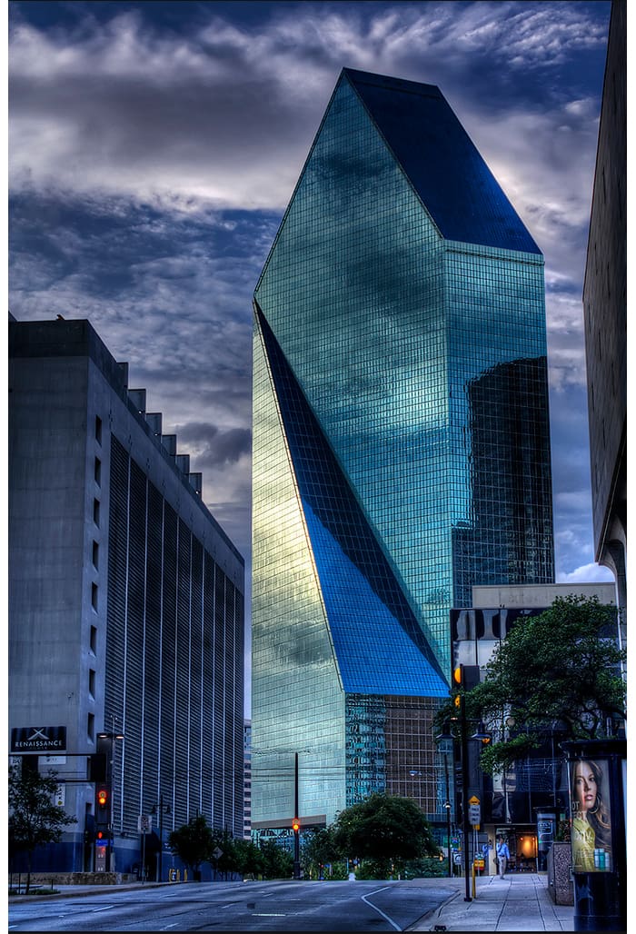 Fountain Place is known for its unique design as a large, multi-faceted prism. Its various slanted sides cause the building to have a completely different profile from all directions.
